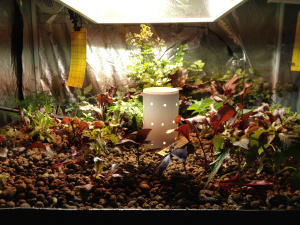 So its been a while since I wrote about what been going on with Bill & Bens HydroWorlds Aquaponic setup. You may remember we took on the ‘Bristol Fish Projects’* Tilapia last year when they lost their site. This was great as we took the fish when they were established & semi grown so we didn’t have to cycle the water. We also took on one of their IBC’s (Intermediate bulk container) which we housed in a 2.4m x 1.2m Century Grow Tent using 2 x 125w Maxi Bright CFL’s (energy saving lamps) & 150w Dual Spec HPS (high Pressure Sodium bulbs when we need a bit of a light boost.
