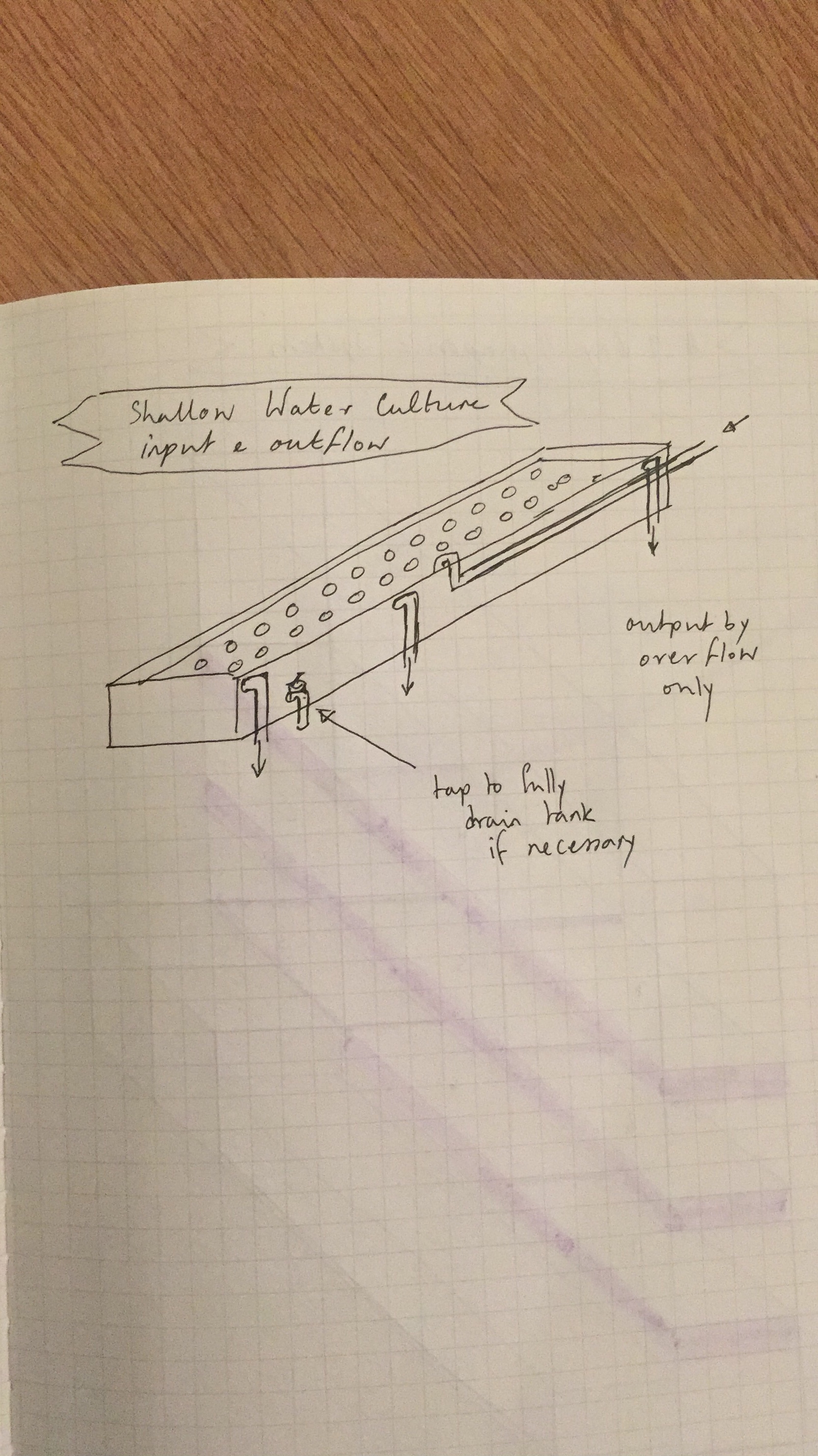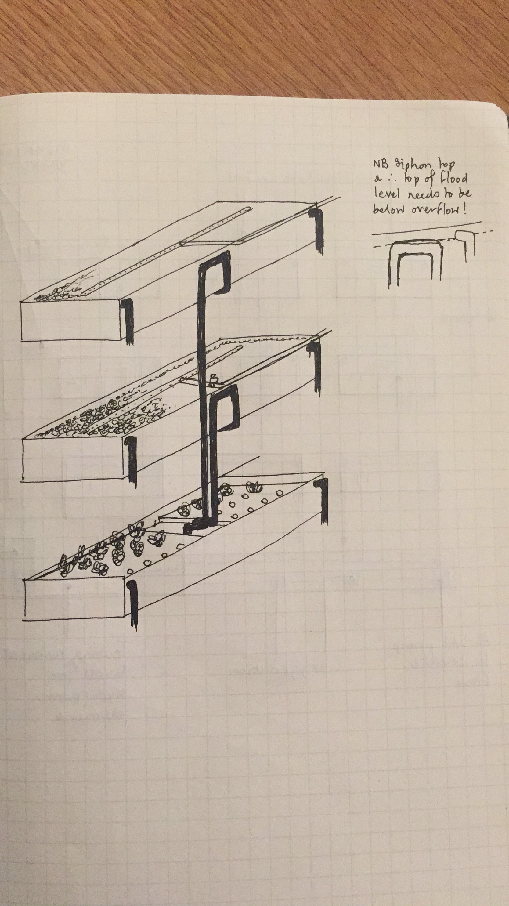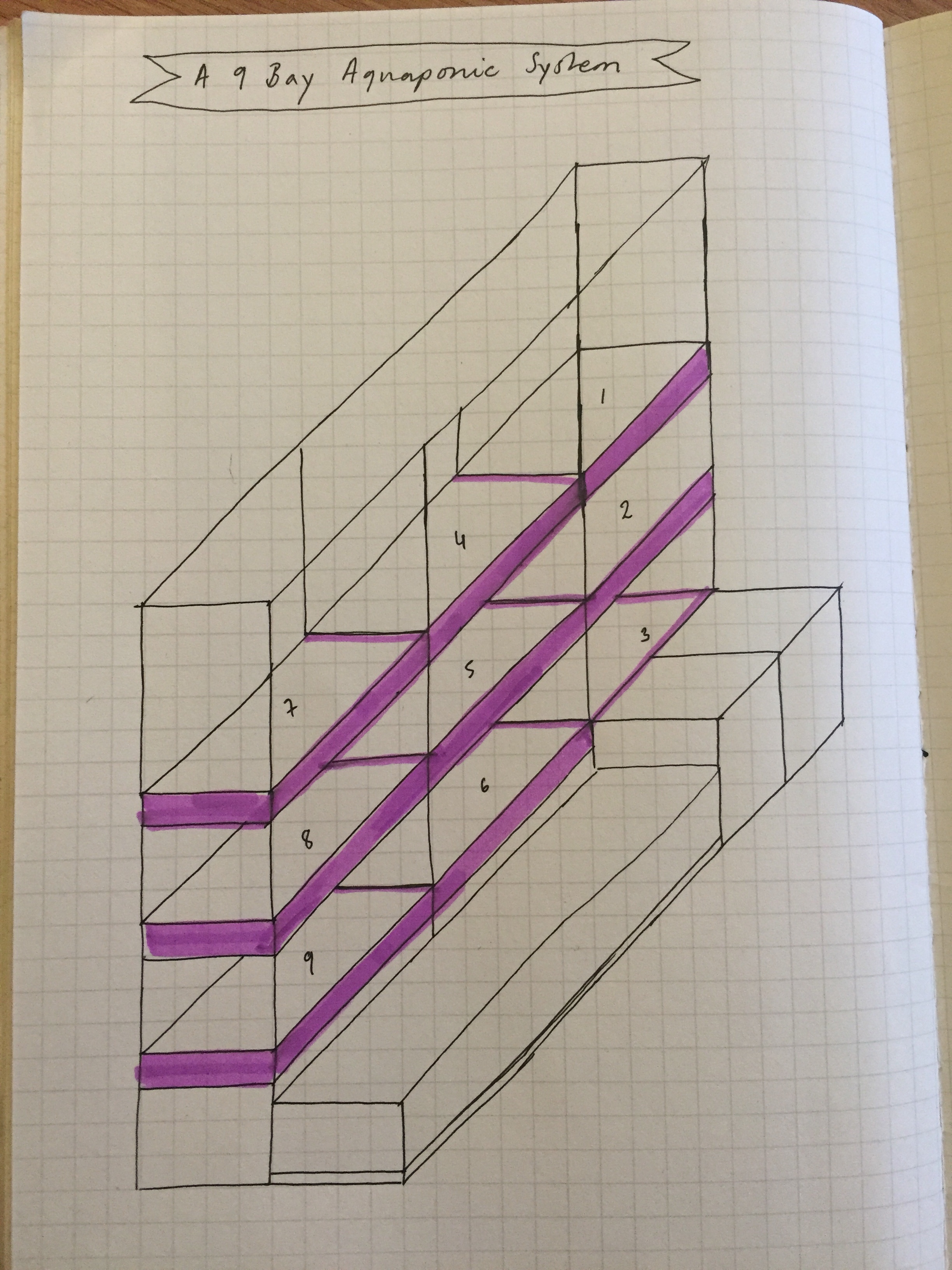 Sam and Alice sat down to discuss what happens next to the pallet-racking and recycled materials based aquaponics module that they’ve been building. The rack is up, boxes have been built using recycled scaffold planks. Butyl lining which we ordered cut to size is waiting to be affixed. Fish tank and sumps are standing by. Big pumps are on the lab table. The electronics have been installed. The controllers for T5 arrays are waiting to be pinned to the bays…. but we can’t make the next move until we know exactly where we want holes for the plumbing to go! So – to the drawing board!