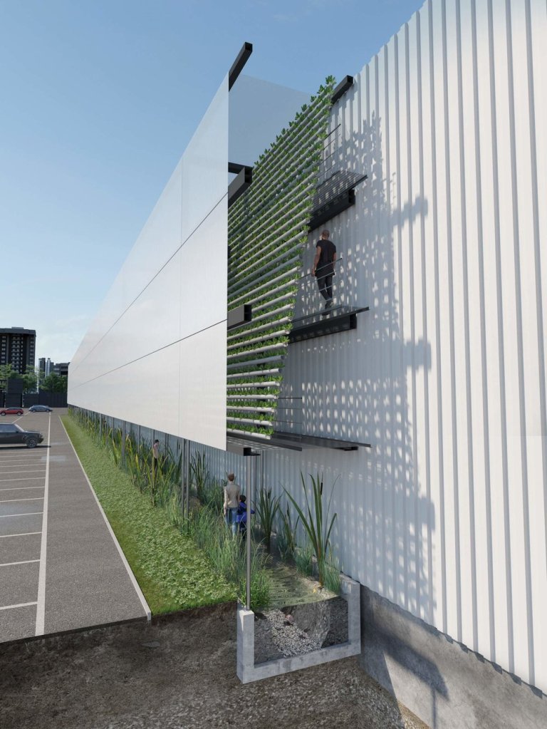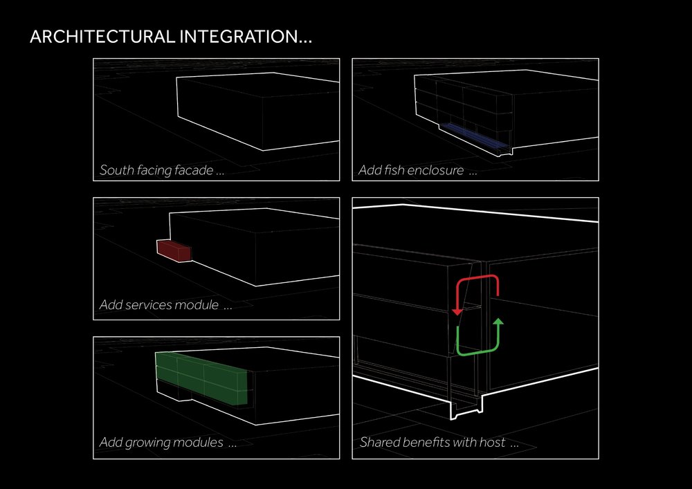 The vertical modular farm is designed to make use of available growing space on the south facades of large urban sheds, to be built from reused steel elements and involves a number of closed-loop principles: between fish and plants, and turning food waste into sustainable fish feed.